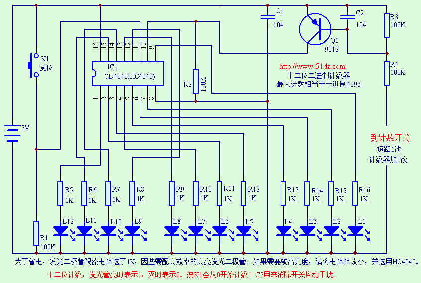 选择分类:当前分类——小说笑话 相关联或者相类似的文章: 到底是天花板还是地面?(716) 晶体管的置换(代换)原则(716) 三个步骤搞掂销售(715) 怎样快速自学电子技术(714) 常用运算放大器列表及代换(713) ^_^你并不比我好 (713) 提高动手能力的最佳选择(712) 上一号(711) 好看的鬼故事1(711) 电子实验套件的包装清单(产品内容(711) 快速识别色环电阻(711) 我爱你 - 20岁版(711) 电子基础知识--继电器(710) TDA2030功放集成电路的资料(710) 电容(709) 电子元器件使用须知(707) 网上赚钱“十大骗术”揭秘(707) 满校尽是大波妹 (705) 午夜的林投公园(704) 洗衣机中的抗菌技术(704) 首页 前页 后页 尾页 本站推荐: | 制作二进制计数器 电路原理图: ![]() 制作的朋友可以参考 ![]() 灯亮表示1,灯灭表示0,本电子制作对学习认识二进制数非常有帮助,该制作也可用于各种简易的计数需要,例如简易生产线产品计数等。 使用这个计数器就一定要会读二进制数(将二进制数转为十进制数。)下面是例子。 十进制数:0,1,2,3,4,5,6,7,8,9,10,11,12,13,14,…… 二进制数:0,1,10,11,100,101,110,111,1000,1001,1010,1011,1100,1101,1110,…… 1、 本站不保证以上观点正确,就算是本站原创作品,本站也不保证内容正确。 2、如果您拥有本文版权,并且不想在本站转载,请书面通知本站立即删除并且向您公开道歉! |