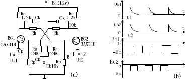 ic1越来越小,ic2越来越大,最后到达BG1截止、BG2导通;接差触发脉冲方波从2端输入,并在t=t2时,有正尖脉冲作用于导通管BG2的基极,又经过正反馈过程,使BG1导通,BG2截止。以后,在1、2端的触发脉冲的轮流作用下,双稳电路的状态也作用相应的翻转,如图一(b)所示。 |