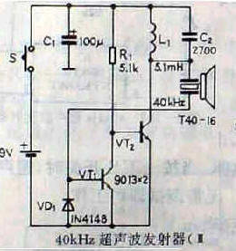 40kHZ超声波发射电路之二,电路中晶体管VT1、VT2组成强反馈稳频振荡器,振荡频率等于超声波换能器T40-16的共振频率。T40-16是反馈耦合元件,对于电路来说又是输出换能器。T40-16两端的振荡波形近似于方波,电压振幅接近电源电压。S是电源开关,按一下S,便能驱动T40-16发射出一串40kHZ超声波信号。电路工作电压9V,工作电流约25mA。发射超声波信号大于8m。电路不需调试即可工作。
