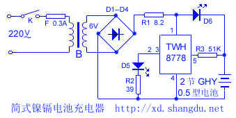 选择分类:当前分类——常用资料 相关联或者相类似的文章: 74系列芯片功能大全(665) ++ CMOS集成电路的工作原理 ++(662) 简单易作的自动充电器 (661) 常用资料下载(659) AT89C2051驱动步进电机的电路和源码(658) 电动自行车开关电源充电器电原理图(657) PM50/60数码智能语声电路开发系统 (657) 实用应急灯的制作 (649) MCU芯片引脚及主要特性(645) 十四位数码管动态扫描驱动程序(643) 简式镍镉电池充电器 (640) Protel99SE 内功心法 (638) 74系列集成电路的分类及区别 (636) 密封铅酸蓄电池的充电特性(636) BH1417F无线发射IC(634) 89C51-ISD4000语音单片机通用开发板(631) 用ISD器件实现现场语音分段录音与随机组合放音 (629) 200W稳压逆变电源(627) 与初学者谈低功耗设计(626) 步进电机14问(626) 首页 前页 后页 尾页 本站推荐: | 简式镍镉电池充电器 本镍镉电池充电电路能批示电池是否已充足电,电路如下图: 接通开关K,220伏交流市电经变压器B变压,D1-D4整流后,通过R1、D6给2节GNY0.5型电池(5号镍镉电池)以500mA的电流进行充电。D6发光指示正在充电,此时,TWH8778开关集成电路控制极⑤脚开启电压小于1.6V,电路不能导通,因此D5不亮。随着充电的继续进行。GNY电池充电电流逐渐减小,电池端电压逐渐升高,TWH8778的控制极⑤脚电压也逐渐升高,当等于1.6V时,电路导通,D5发光,指示电池已充足电。 1、 本站不保证以上观点正确,就算是本站原创作品,本站也不保证内容正确。 2、如果您拥有本文版权,并且不想在本站转载,请书面通知本站立即删除并且向您公开道歉! |