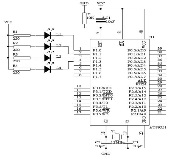 用AT89S51的定时/计数器T0产生2秒钟的定时,每当2秒定时到来时,更换指示灯闪烁,每个指示闪烁的频率为0.2秒,也就是说,开始L1指示灯以0.2秒的速率闪烁,当2秒定时到来之后,L2开始以0.2秒的速率闪烁,如此循环下去。0.2秒的闪烁速率也由定时/计数器T0来完成。