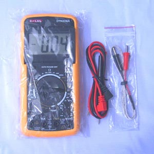 一、概述: DT9208A型数字万用表是一种操作方便、读数精确、功能齐全、体积小巧、携带方便、使用电池做电源的手持袖珍式大屏幕液晶三位半显示数字万能表。可用来测量直流电压/电流;电阻;电容;频率;二极管正向压降;温度;晶体管HFE参数以及电路通断等。可供工程设计、实验室、生产实验和工业维修等应用。