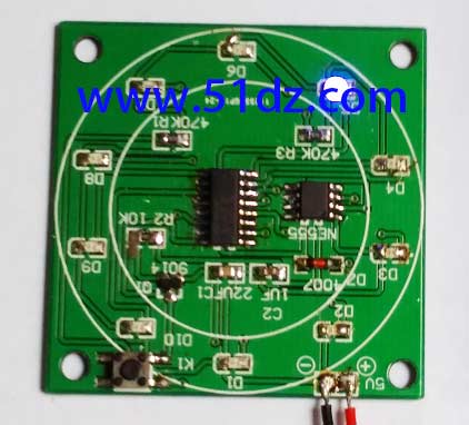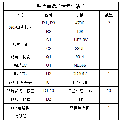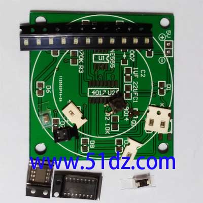 贴片流水灯套件: 本电路主要由脉冲产生器和一个十进制计数器CD4017电路组成。脉冲产生器由NE555及外围元件构成多谐振荡器,当按下按键K1时Q1导通,NE555的3脚输出脉冲,则CD4017的10个输出端轮流输出高电平驱动10只LED轮流发光。松开按键后,由于有电容C1的存在,Q1不会立即截止,随着C1两端电压的下降,Q1的导通程序逐渐减弱,3脚输出脉冲的频率变慢,LED移动频率也随之变慢。最后当C1放电结束后。Q1截止,NE555的3脚不再输出脉冲,LED停止移动。