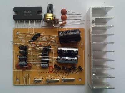 4.安装25V 2200UF电解电容,BA5406和散热片用螺丝固定后插在电路板上再焊接并用螺丝固定在电路板上。说明:INPUT的3针,中间为地,两边是左右声道信号输入端,OUTPUT的4针,中间两根为地,边上的为左右声道输出端。音调和音量调节部分已提供原件,分别为2.2K电阻2个,0.1UF涤纶电容2个,10K双联电位器2个,10K单联电位器1个,只需按照原理图焊接即可。