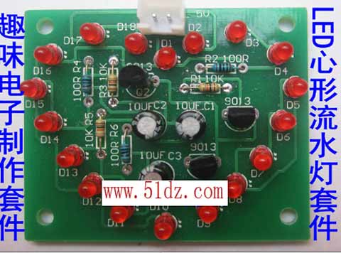 心形流水灯套件:3组18只LED便会被轮流点亮,同一时刻有2组共12只LED被点亮。这些LED被交叉排列呈一个心形图案,不断的循环闪烁发光,达到动感显示的效果。