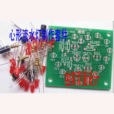 心形流水灯套件相关配件:双面玻纤绿油印刷电路板1块,所有元件,元件清单,原理图及相关制作说明。