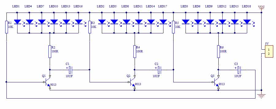 从原理图上可以看出,18只LED被分成3组,每当电源接通时,3只三极管会争先导通,但由于元器件存在差异,只会有1只三极管最先导通,这里假设Q1最先导通,则LED1这一组点亮,由于Q1导通,其集电极电压下降使得电容C2左端下降,接近0V,由于电容两端的电压不能突变,因此Q2的基极也被拉到近似0V,Q2截止,故接在其集电极的LED2这一组熄灭。此时Q2的高电压通过电容C3使Q3集电极电压升高,Q3也将迅速导通,LED3这一组点亮。因此在这段时间里,Q1、Q3的集电极均为低电平,LED1和LED3这两组被点亮,LED2这一组熄灭,但随着电源通过电阻R2对C2的充电,Q2的基极电压逐渐升高,当超过0.7V时,Q2由截至状态变为导通状态,集电极电压下降,LED2这一组点亮。与此同时,Q2的集电极下降的电压通过电容C3使Q3的基极电压也降低,Q3由导通变为截至,其集电极电压升高,LED3这一组熄灭。接下来,电路按照上面叙述的过程循环,3组18只LED便会被轮流点亮,同一时刻有2组共12只LED被点亮。这些LED被交叉排列呈一个心形图案,不断的循环闪烁发光,达到动感显示的效果。供电电压4.5V-5V。