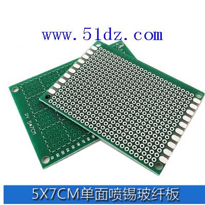 单面喷锡玻纤板万能板5*7cm,50mm×70mm,板厚1.6mm,绿油和白字。 特别是电子爱好者和产品开发者在制作电路或者研制样机时最理想的选择,批量价优,欢迎来电联系。